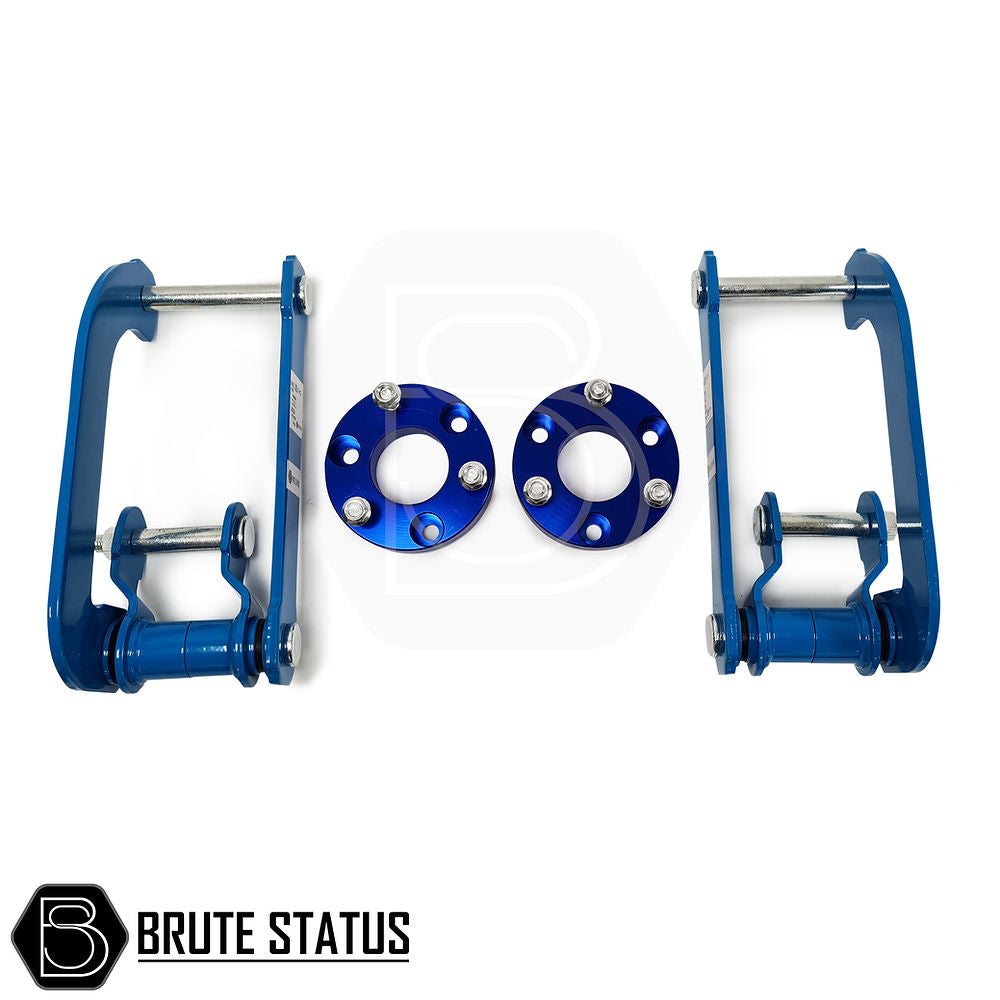The rear lift shackles are engineered from 8mm thick heavy duty steel and powder coated for longevity with greaseable chrome moly pins.